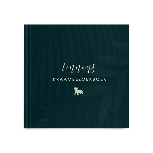 Kies voor dit kraambezoekboek met welpje en bladeren en bewerk gemakkelijk in de editor.