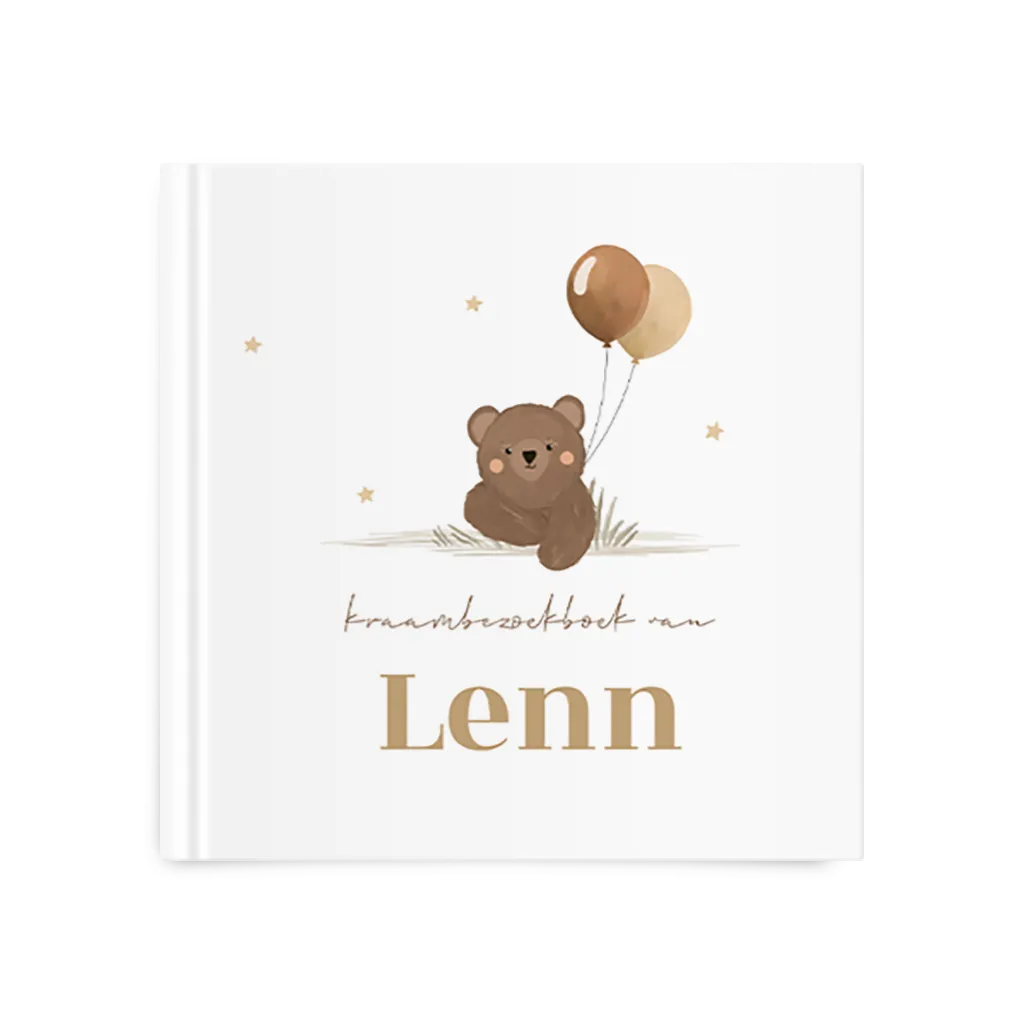 Kies voor dit kraambezoekboek met beertje en ballonnen. Je past het design gemakkelijk aan in de online editor!
