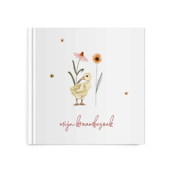 Kies voor dit kraambezoekboek met eendje en bloemen en bewerk gemakkelijk in de editor.