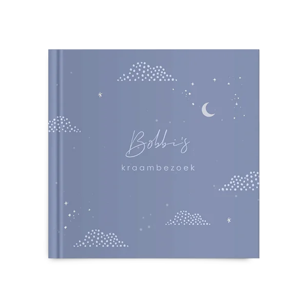 Kies voor dit kraambezoekboek met speelse maantjes en bewerk gemakkelijk in de editor.