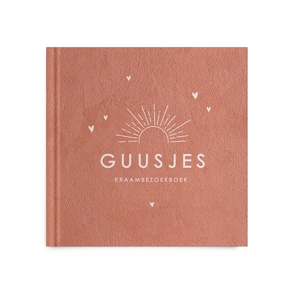 Kies voor dit kraambezoekboek met zon en hartjes en bewerk gemakkelijk in de editor.