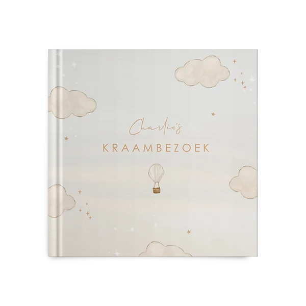 Kies voor dit kraambezoekboek met schattige luchtballon, wolkjes en sterretjes en bewerk gemakkelijk in de editor.