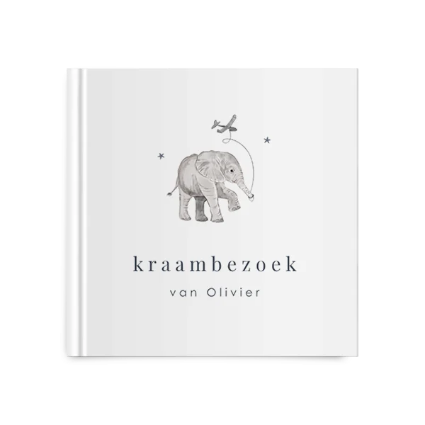Kies voor dit kraambezoekboek met olifantje met vliegtuigje en bewerk gemakkelijk in de editor.
