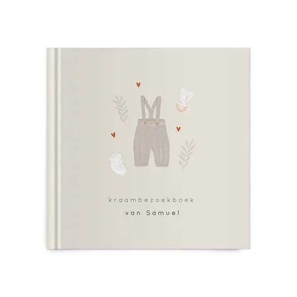 Kies voor dit kraambezoekboek met tuinbroekje en bijtring en bewerk gemakkelijk in de editor.