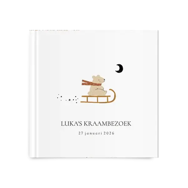 Kies voor dit winterse kraambezoekboek met schattig beertje op de slee en bewerk gemakkelijk in de editor.