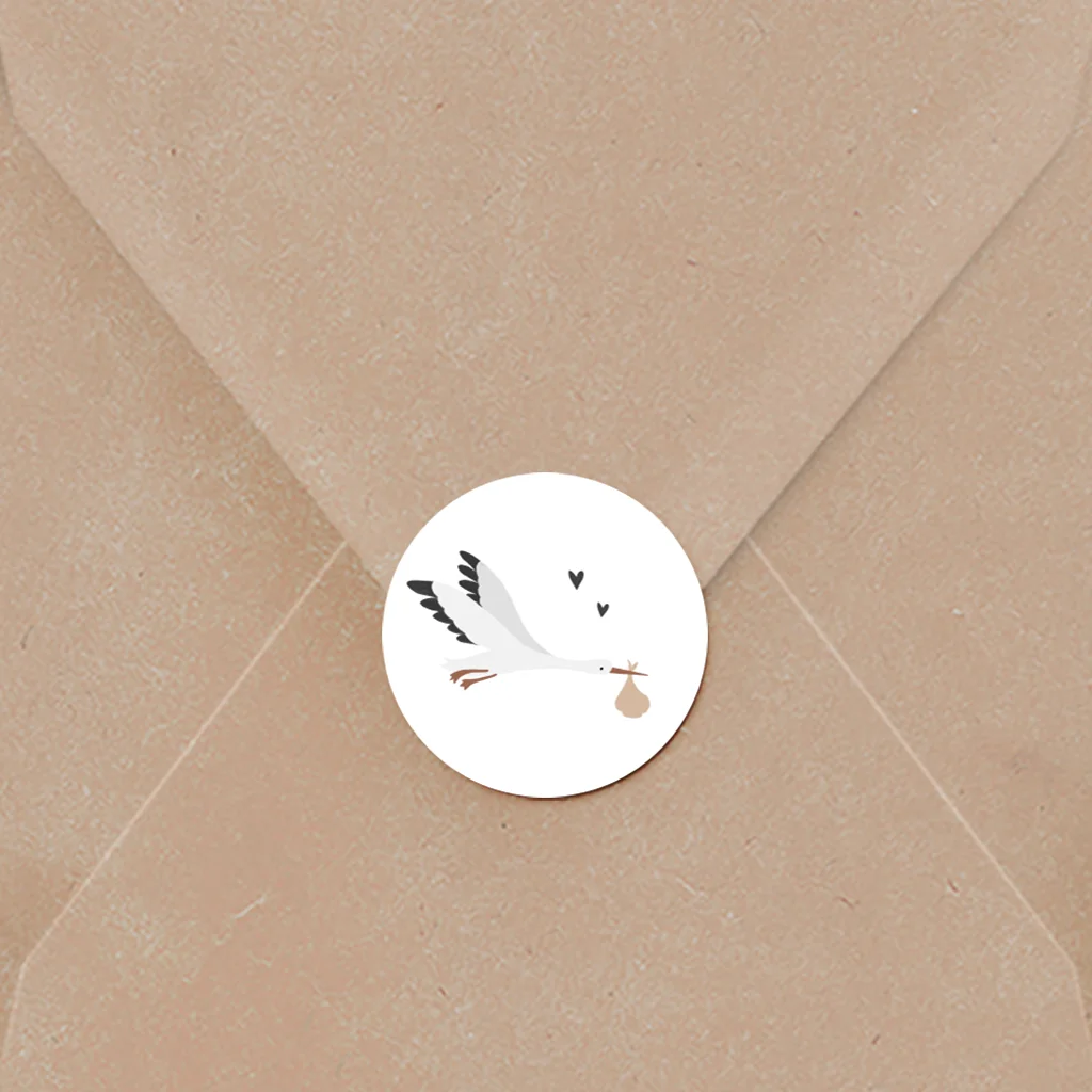 Hoe schattig zijn deze sluitstickers met ooievaar? Je kunt de stickers zelf naar wens aanpassen in onze editor.