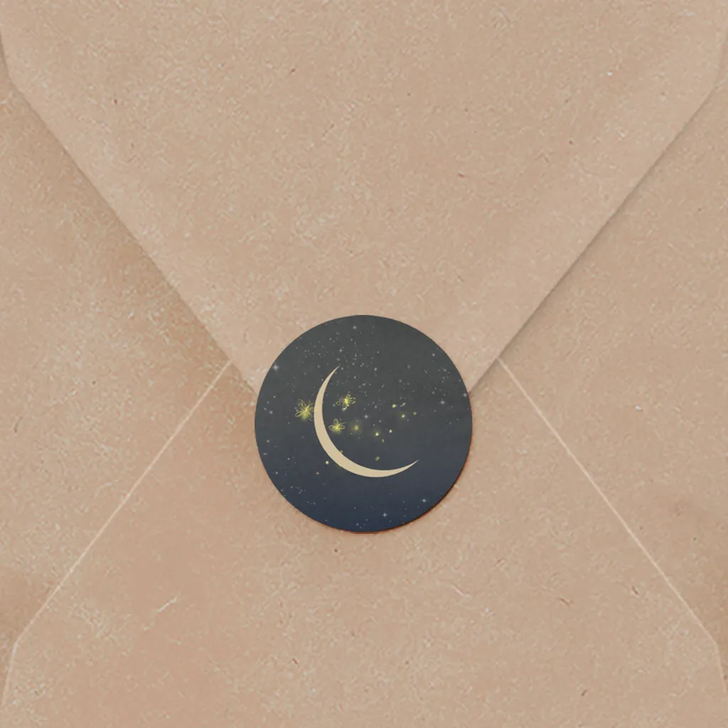 Maak een feestje van het geboortekaartje met deze bijpassende blauwe sluitsticker met maan en sterretjes! Je kunt de sticker zelf bewerken in onze editor.