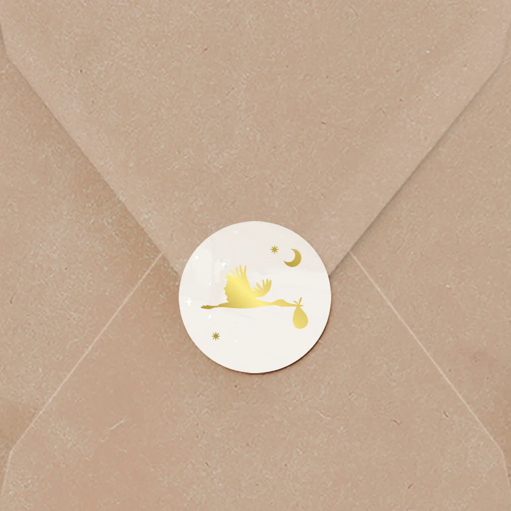 Sluitsticker geboortekaartje met ooievaar van goudfolie