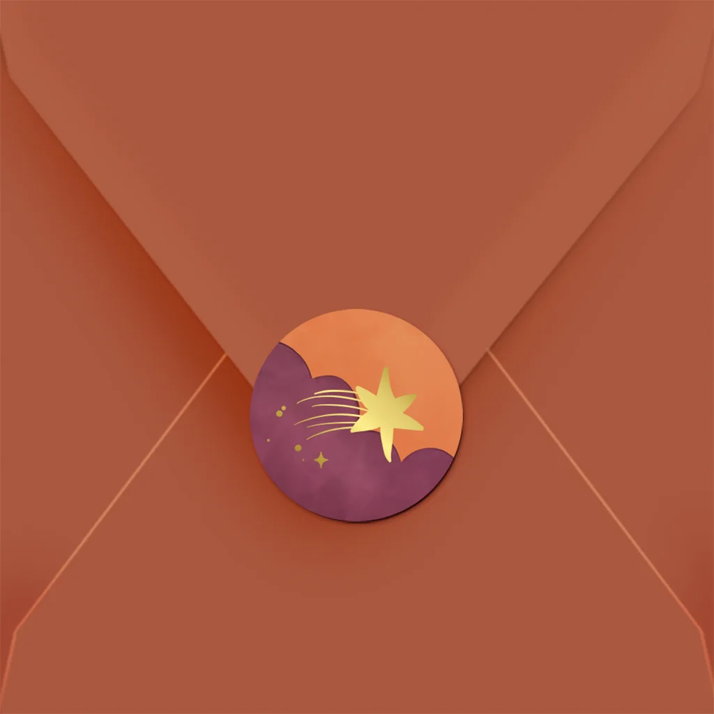 Sluitsticker geboortekaartje met vallende ster van goudfolie