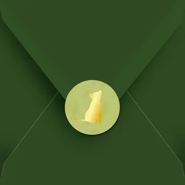 Je kunt deze groene sluitsticker voor op de envelop met welpje in goudfolie zelf naar wens bewerken in onze editor en pas zelf de kleuren of lettertypes aan.