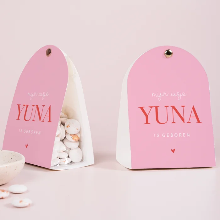 Hoera, een zusje! Maak een geboorte traktatie voor in de klas of het kinderdagverblijf met deze schattige roze snoepzakjes. Personaliseer de buitenzijde van het snoepzakje en bestel meteen de zakjes en splitpen mee om de set compleet te maken. Vul het zakje thuis met snoepjes, zet het geheel in elkaar en tada! Een super schattige traktatie voor een trotse broer of zus.