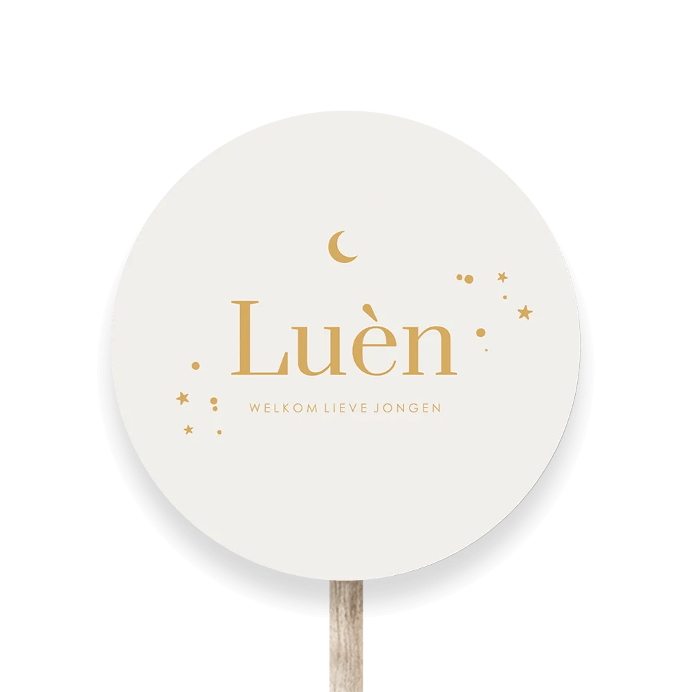 Tuinbord beige met goudkleurige naam, maan en sterretjes