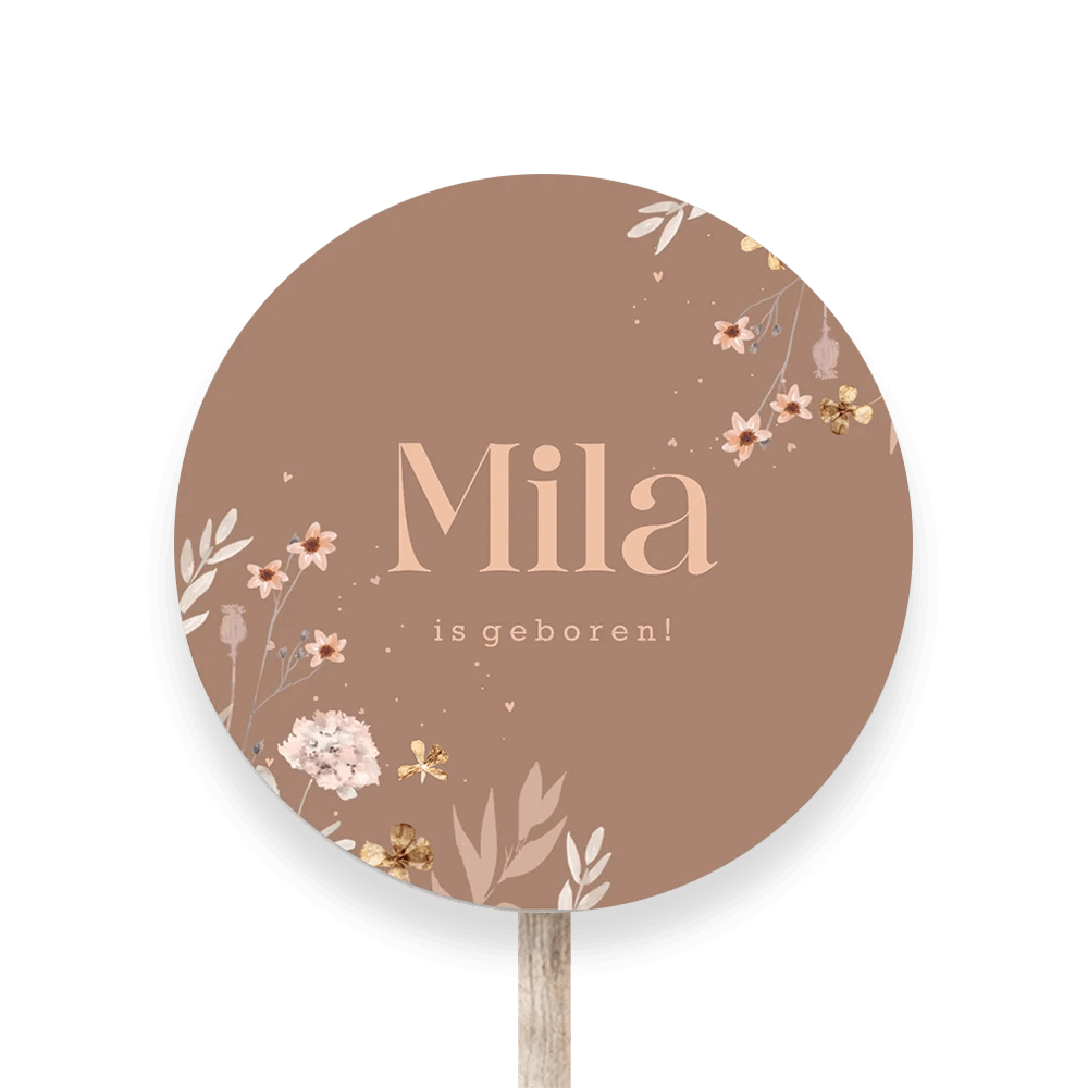 Tuinbord bruin met bloemen en rosékleurige naam