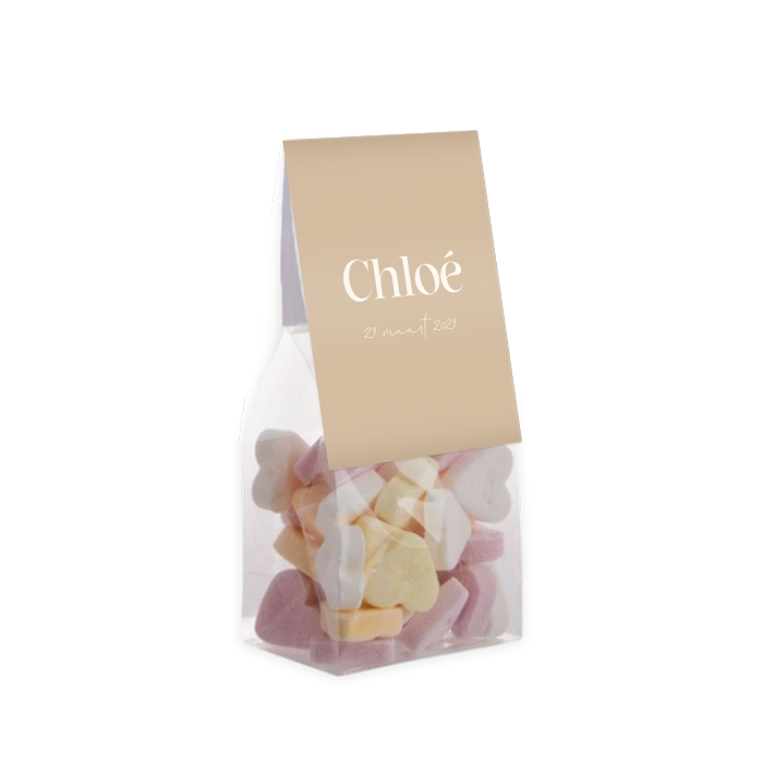 Dit vouwkaartje is een toffe geboorte traktatie. Bedank vrienden en familie in de stijl van je geboortekaartje voor alle warme wensen en attenties. Het kaartje heeft een beige achtergrond met lichte letters. Bestel meteen de transparante zakjes mee, om de doopsuikers compleet te maken. Je hoeft enkel de snoepjes nog zelf uit te zoeken en het geheel in elkaar te zetten. Heerlijk klusje tijdens je verlof!