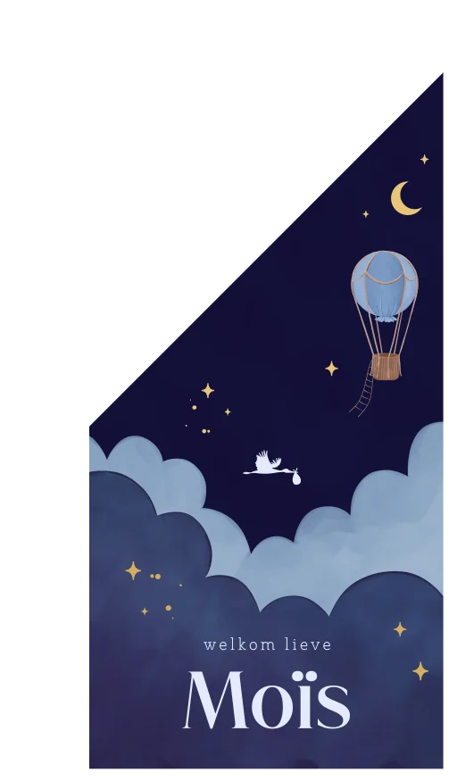 Maak de geboorte van jullie baby bekend met deze mooie geboortevlag in blauw met luchtballon en sterrenhemel.