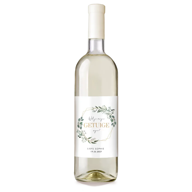 Ben je op zoek naar een stijlvolle manier om jouw getuigen te vragen voor de bruiloft? Kies dan voor dit stijlvolle wijnetiket met eucalyptus takjes.