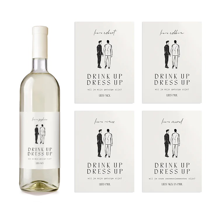 Vraag je getuigen op een originele manier met deze wijnetiketten! Elk etiket is uniek en kan gemakkelijk aangepast worden in de online editor.