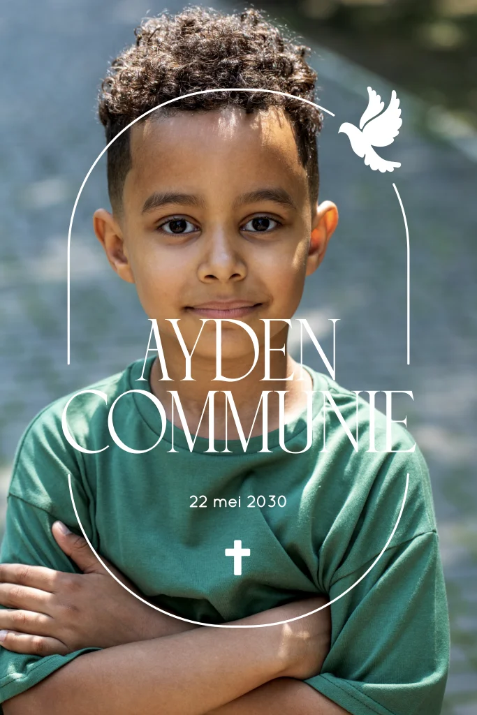 Een stijlvolle foto communie uitnodiging. Ook zie je een kader met een duif. Pas het ontwerp naar wens zelf aan.