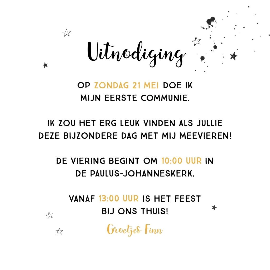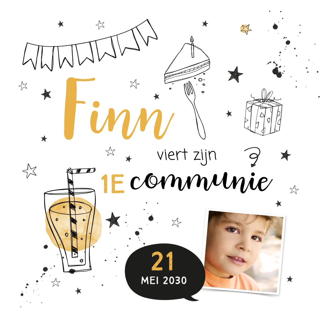 Een vrolijk kaartje voor een Eerste Communie feestje in zwart wit met symbolen en sterretjes en okergeel. Combineer met een okergele envelop, dat maakt de uitnodiging compleet!