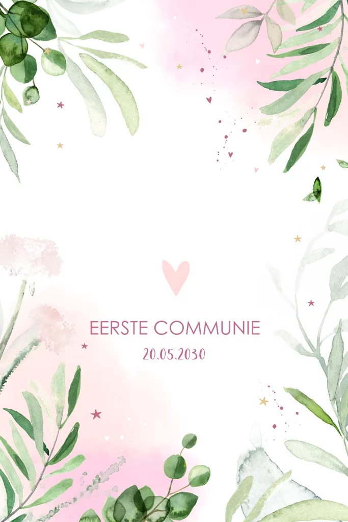 Lief communiekaartje met water color en bladeren. De naam wordt in goudfolie gedrukt voor een extra feestelijke uitstraling.