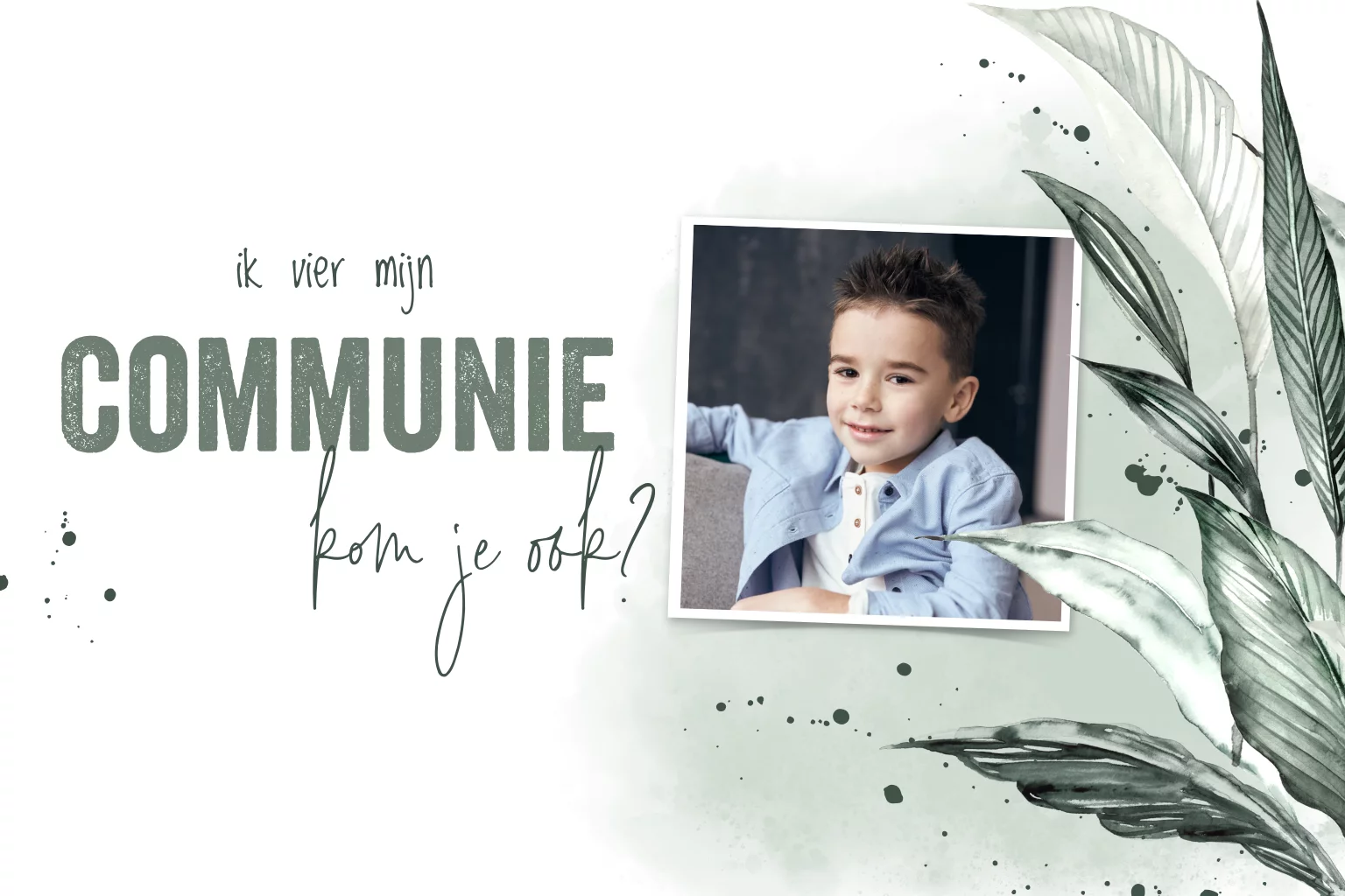 Communiekaartje met jungle bladeren. Op de voorkant van deze Communie uitnodiging is ruimte voor een persoonlijke foto.