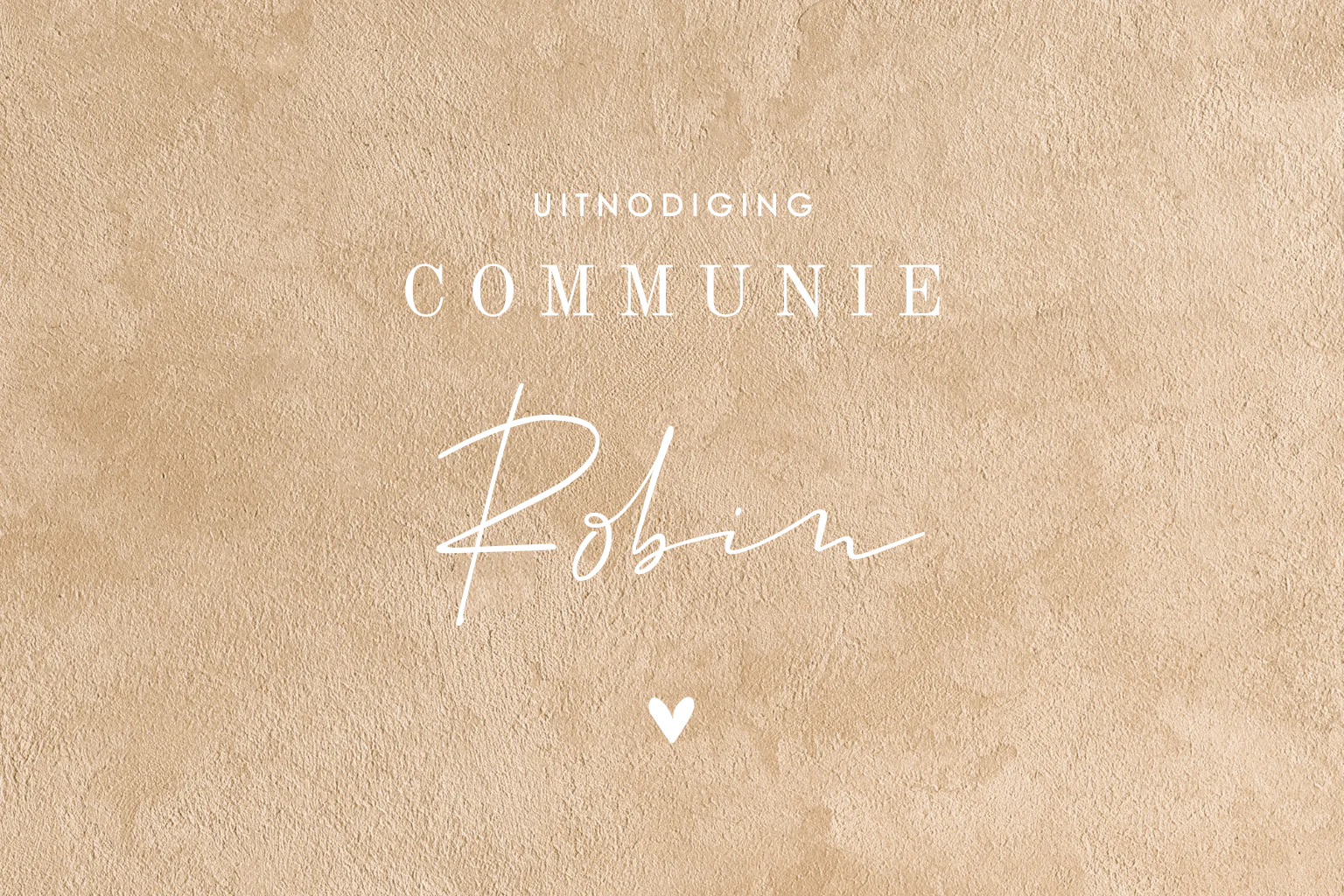 Een neutrale uitnodiging voor de communie van een jongen of meisje in beige velvet-look. De tekst staat in verschillende lettertypes in luxe goudfolie waardoor je een stijlvol kaartje krijgt, pas de kaart naar wens aan in de online editor.