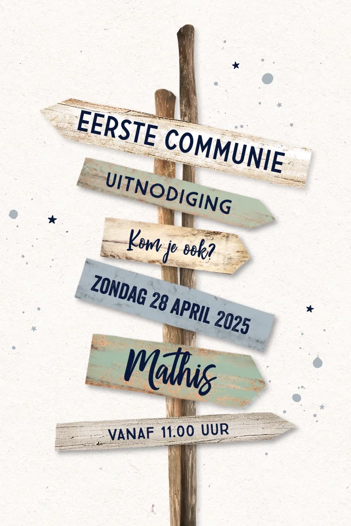 Stoere uitnodiging voor communie van een jongen. Op het kaartje staat een strandpaal met wegwijzers. Het kaartje is helemaal naar wens aan te passen in de online editor.
