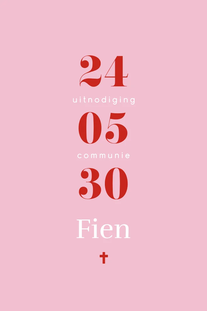 Hippe roze communie uitnodiging met rode datum. Pas het ontwerp naar wens zelf aan.