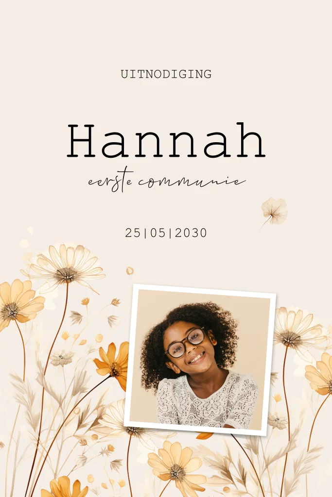 Nodig vrienden en familie uit voor de Eerste Communie van jouw dochter met deze uitnodiging met bloemen en eigen foto.