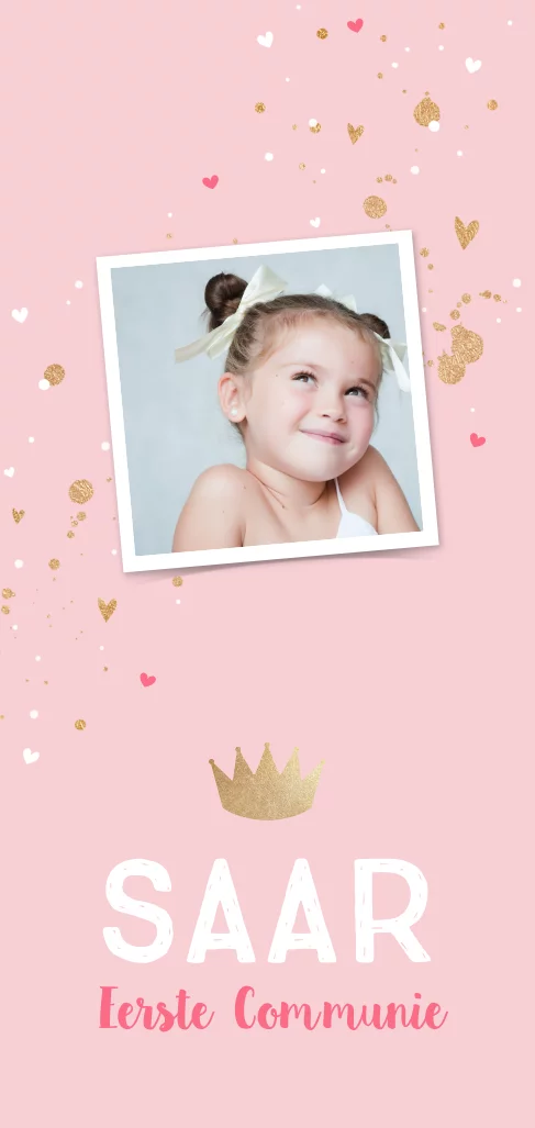 Uitnodigingskaart langwerpig formaat voor de Eerste Communie met foto, gouden kroontje en spettertjes.