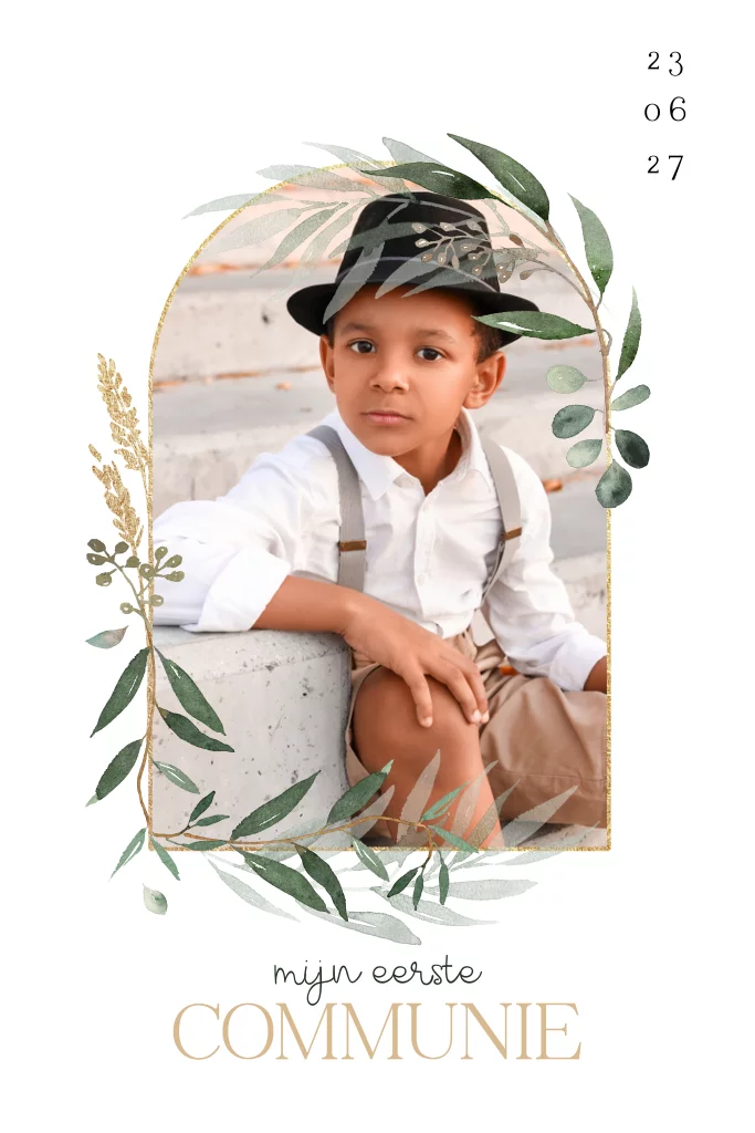 Op zoek naar een uitnodiging voor de Eerste Communie? Kies voor dit stijlvolle kaartje in botanische stijl met ruimte voor een eigen foto.