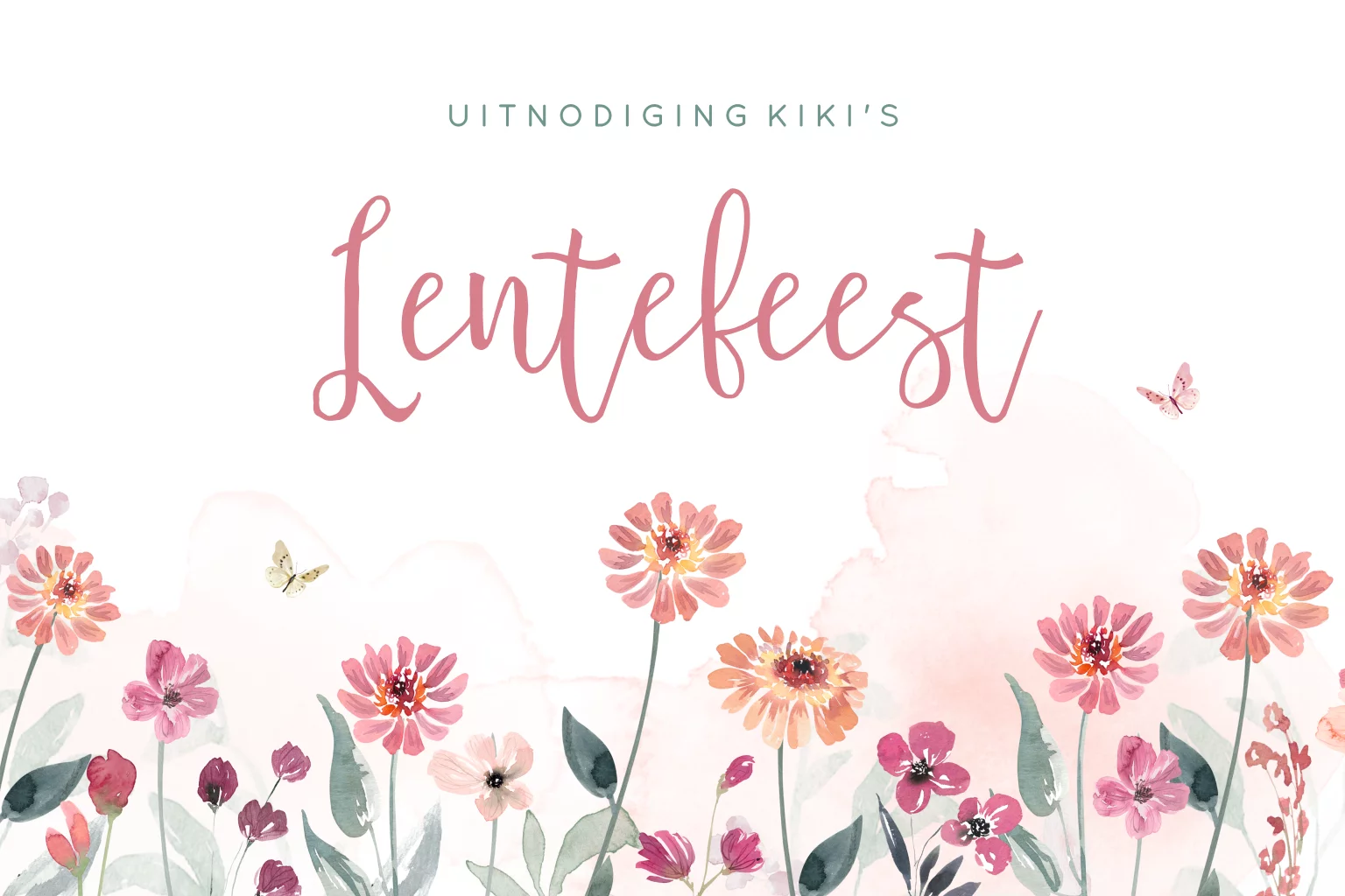 Een vrolijke Lentefeest uitnodiging met bloemetjes en vlinders. Dit prachtige kaartje kun je bewerken in de online editor.
