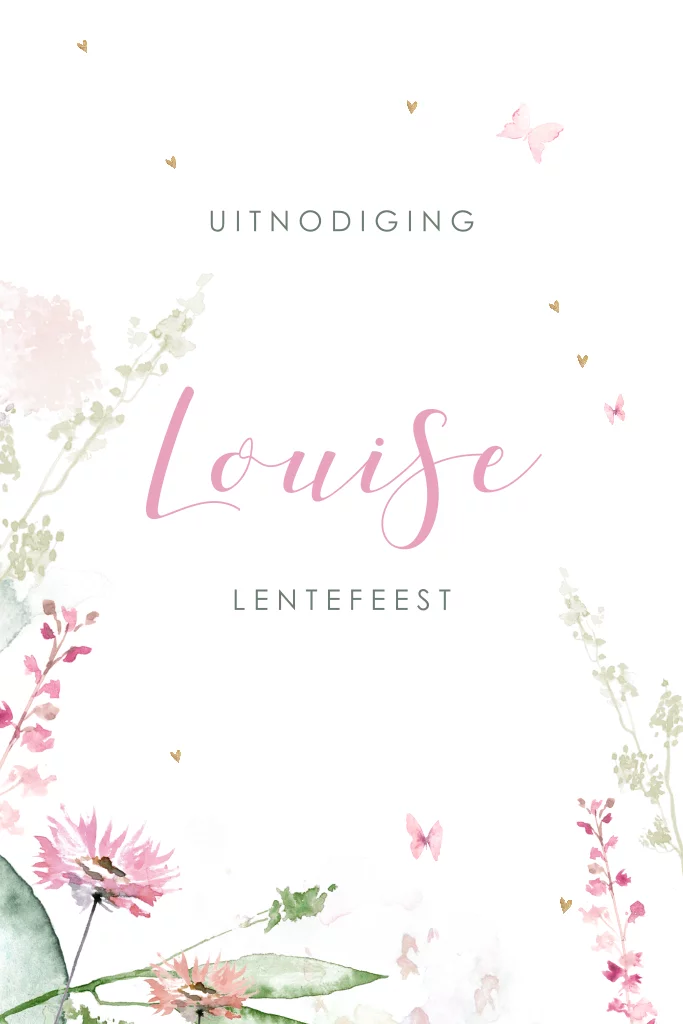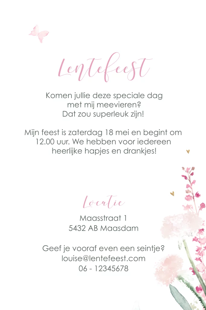 Een lieve uitnodiging voor het Lentefeest met bloemen. Op de binnenzijde is er ruimte voor het toevoegen van een persoonlijke foto.