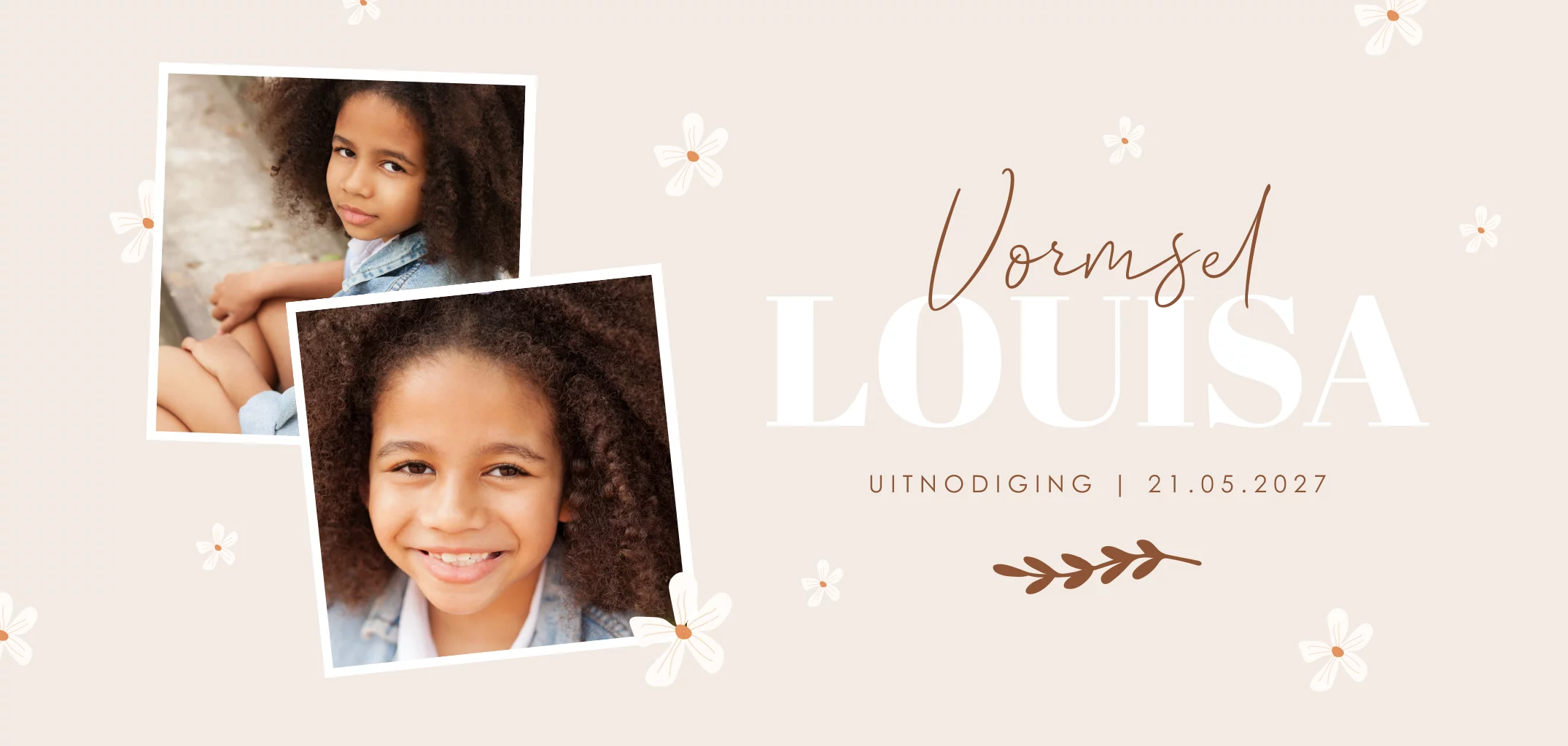 Jouw dochter gaat haar Vormsel doen! Nodig vrienden en familie uit met deze vrolijke kaart in panorama vorm. De foto's maken de uitnodiging extra persoonlijk!
