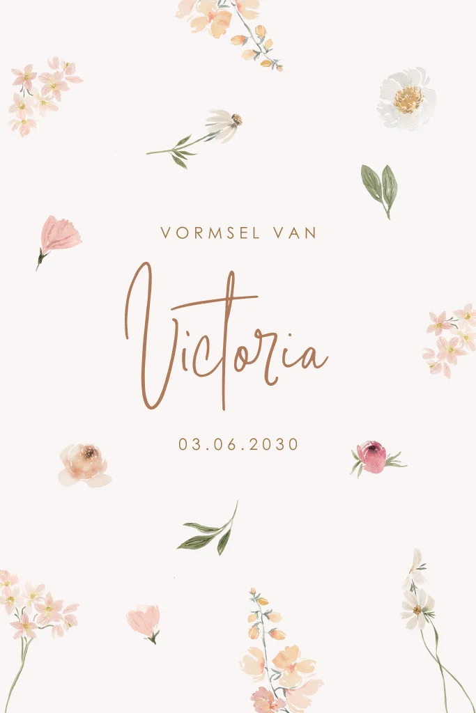 Een vrolijke uitnodiging voor vormsel. Het kaartje heeft een lichte achtergrond met daarop verschillende soorten bloemen. Pas het ontwerp naar wens zelf aan.