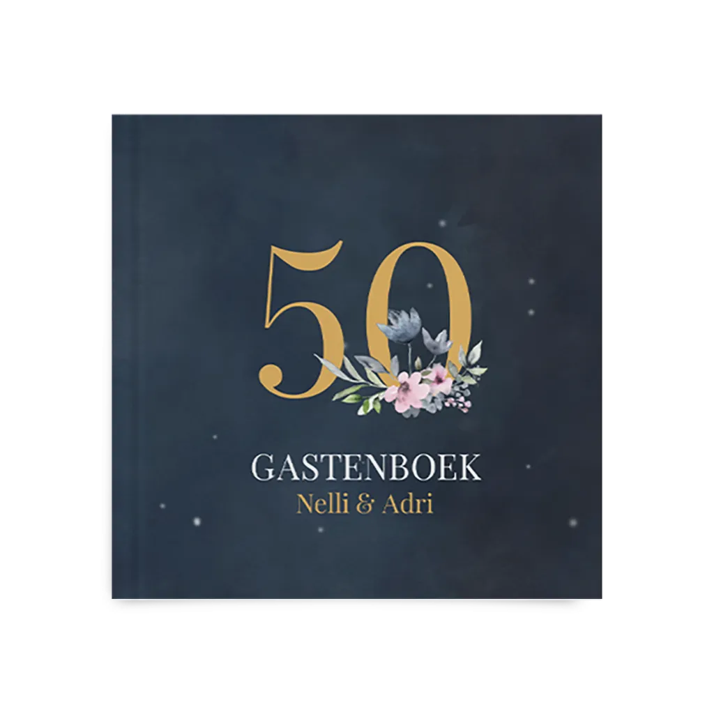 Gastenboek 50 jarig huwelijksjubileum in blauw met bloemen