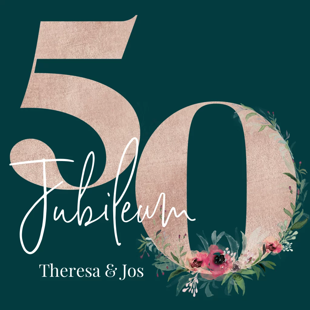 Stijlvolle jubileumkaart voor een vijftigjarige bruiloft met rosé goud gecombineerd met donkergroene achtergrond.