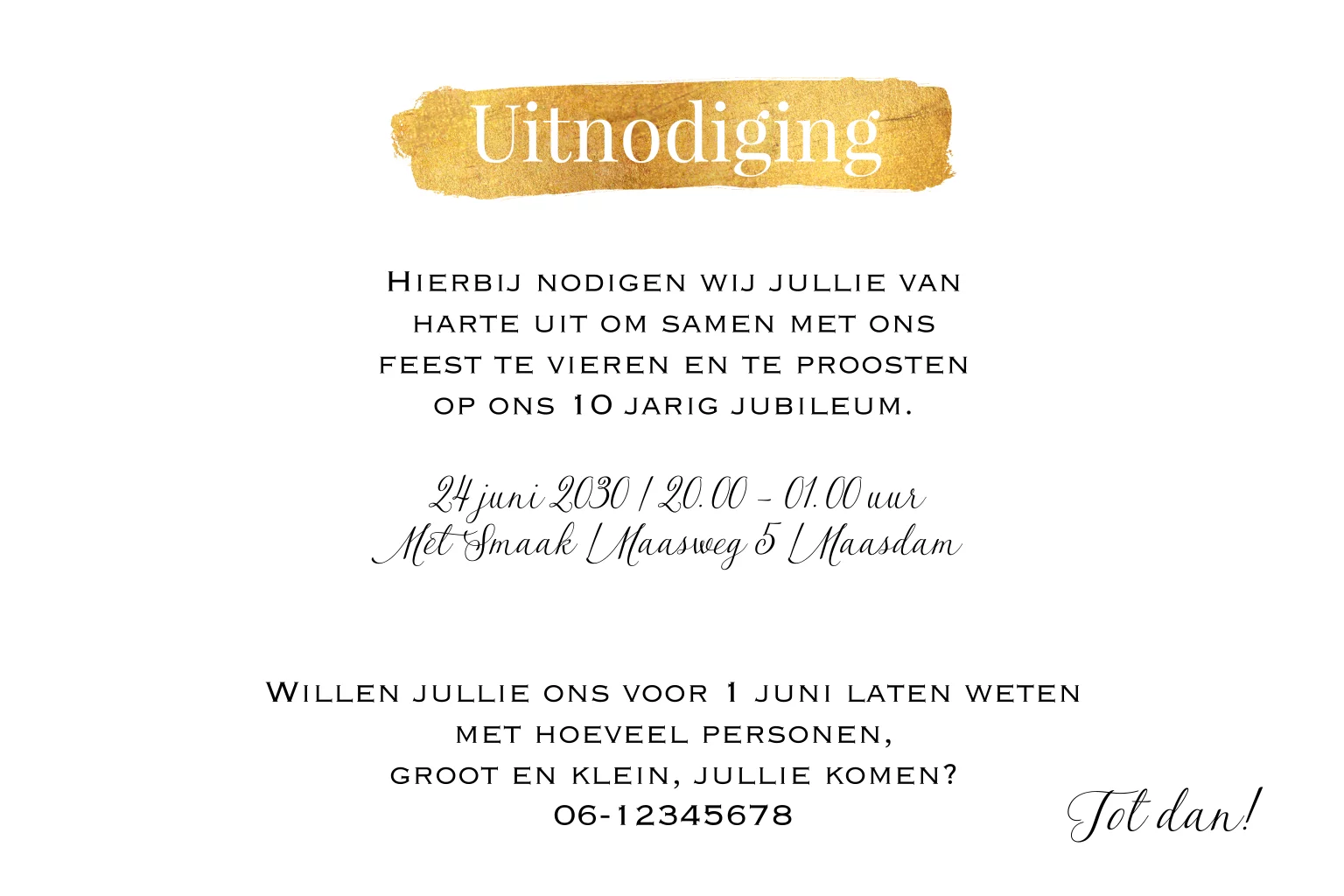 Stijlvolle jubileumkaart met foto en gouden details voor jullie tinnen huwelijk.