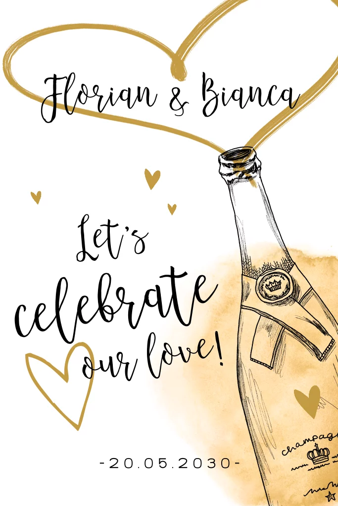 Huwelijksverjaardag uitnodiging met champagnefles en liefdevolle hartjes. Let's celebrate our love! Een gouden envelop past mooi bij deze jubileum uitnodiging.