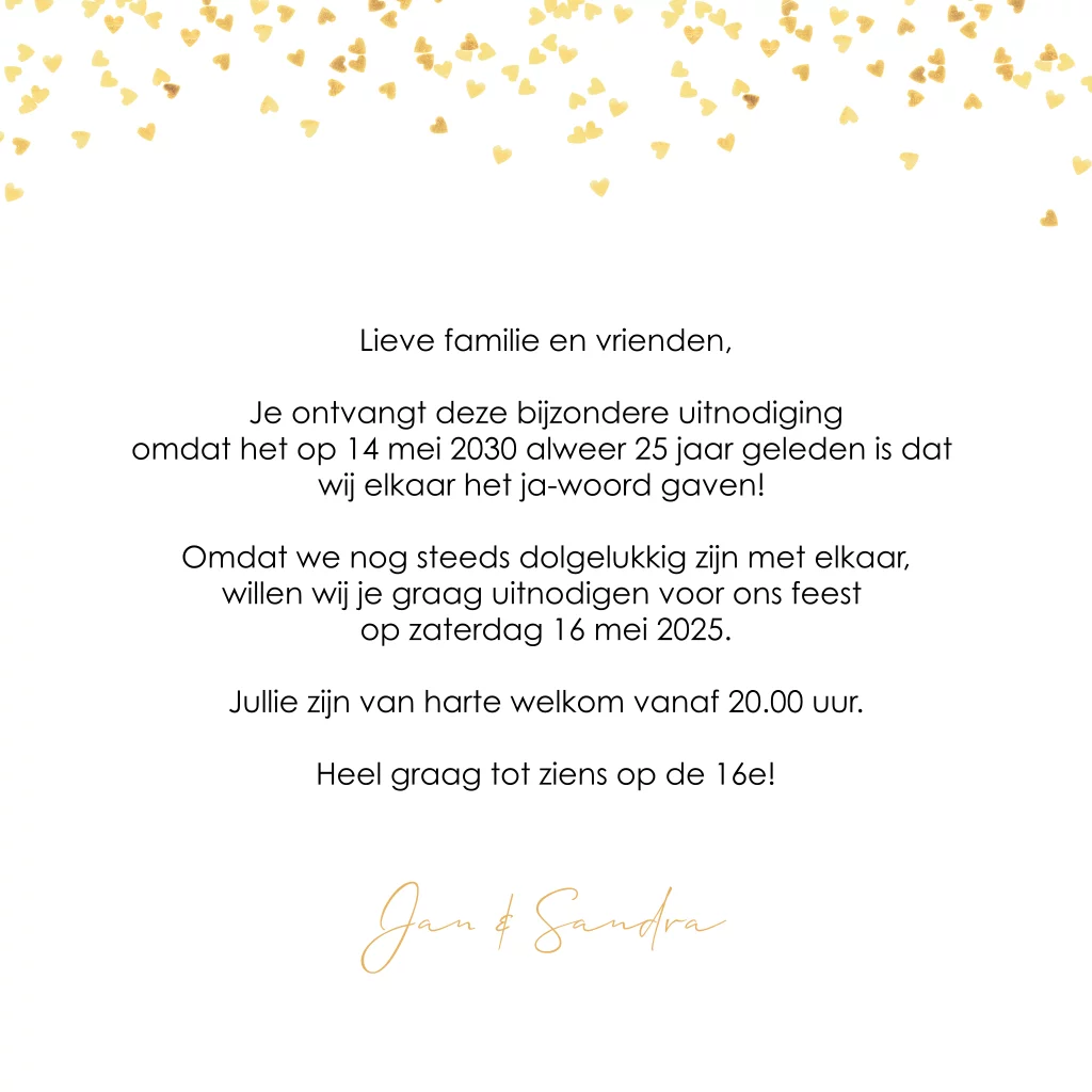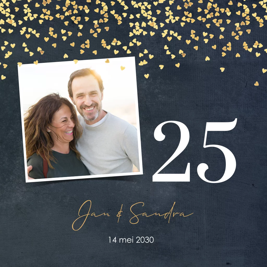 Uitnodiging 25 jaar getrouwd met gouden hartjesregen. Vervang eenvoudig de foto op de voorzijde en maak zo je persoonlijke jubileumkaart.