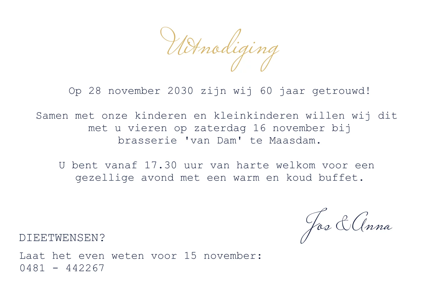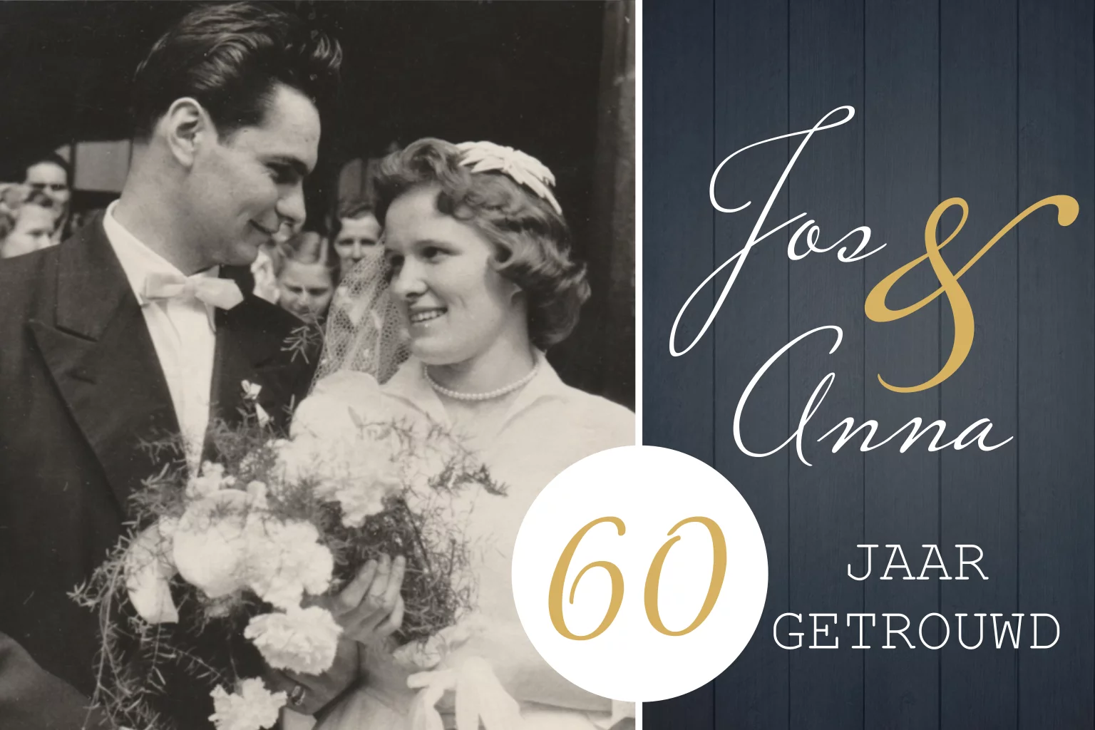 Jubileumkaart voor een zestigjarig huwelijk met een foto van de bruiloft, chic in blauw met gouden details.