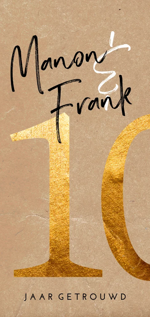 Originele jubileumkaart in hip formaat met kraft achtergrond, mooie typografie en het getal tien in goud.