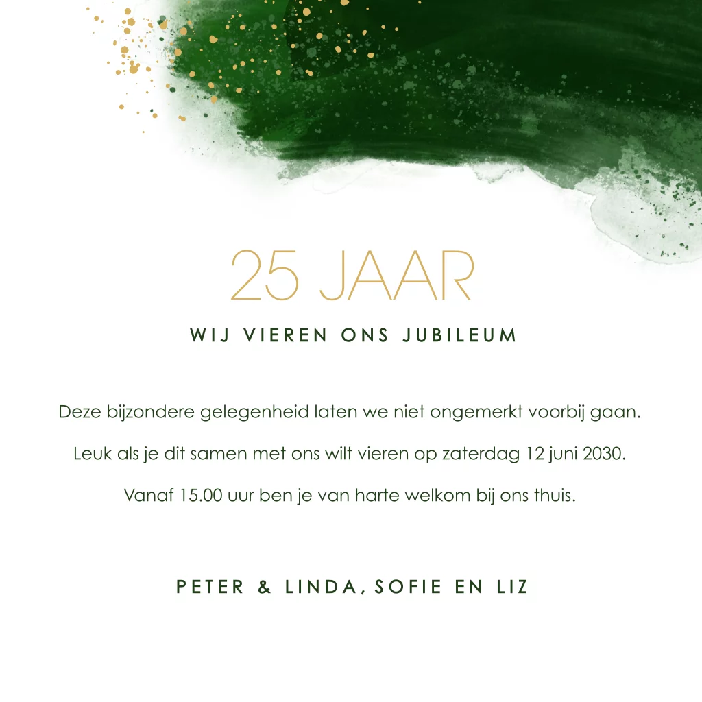 Originele uitnodiging zilveren bruiloft met donkergroene watercolor. Maak de uitnodiging persoonlijk door je eigen foto's toe te voegen.