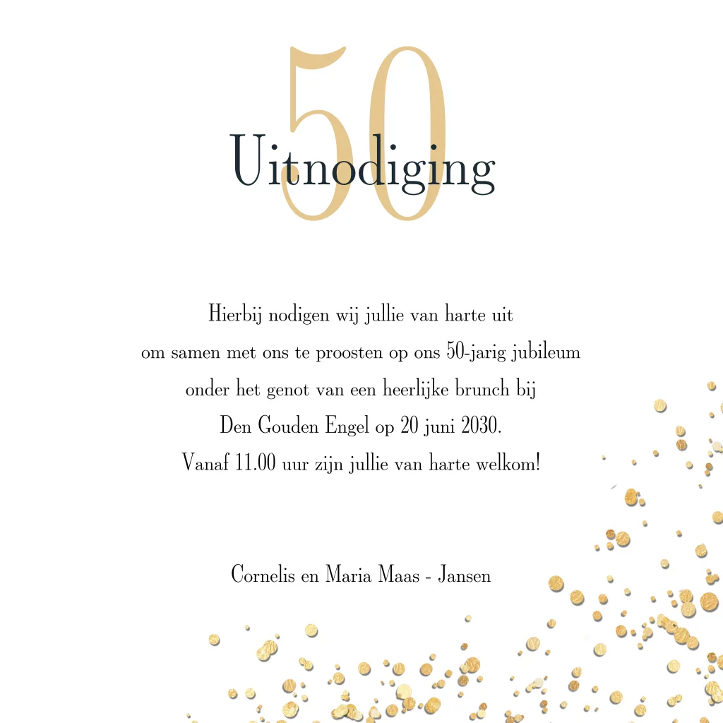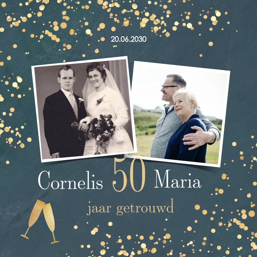 Deze jubileumkaart 50 jarig huwelijk is een feestje om te versturen! Met vrolijke confetti in goud en persoonlijke foto's. Een mooie feestelijke jubileum uitnodiging.