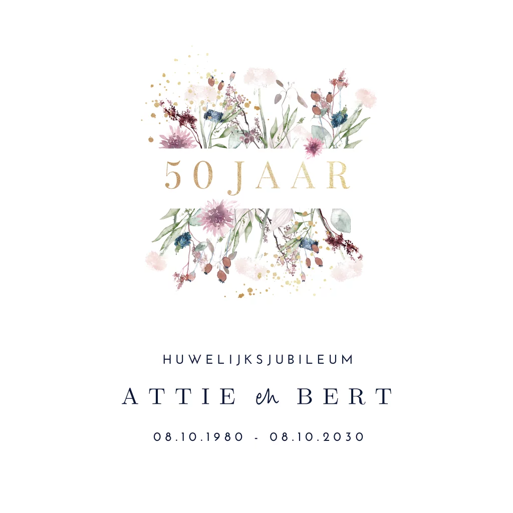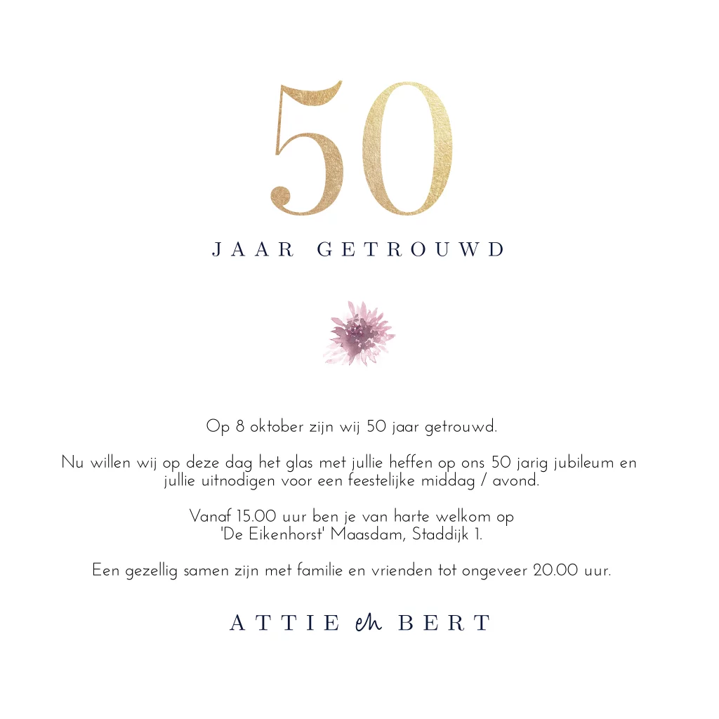 Uitnodiging 50-jarig huwelijksjubileum met bloemen en takjes en klassieke typografie. Mooi op oud-hollands papier.