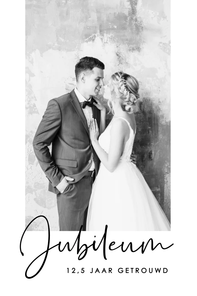 Deze kaart 12,5 jaar getrouwd maak je eenvoudig persoonlijk door het toevoegen van jullie trouwfoto op de voorzijde. In combinatie met de typografie heb je een stijlvolle jubileum uitnodiging.
