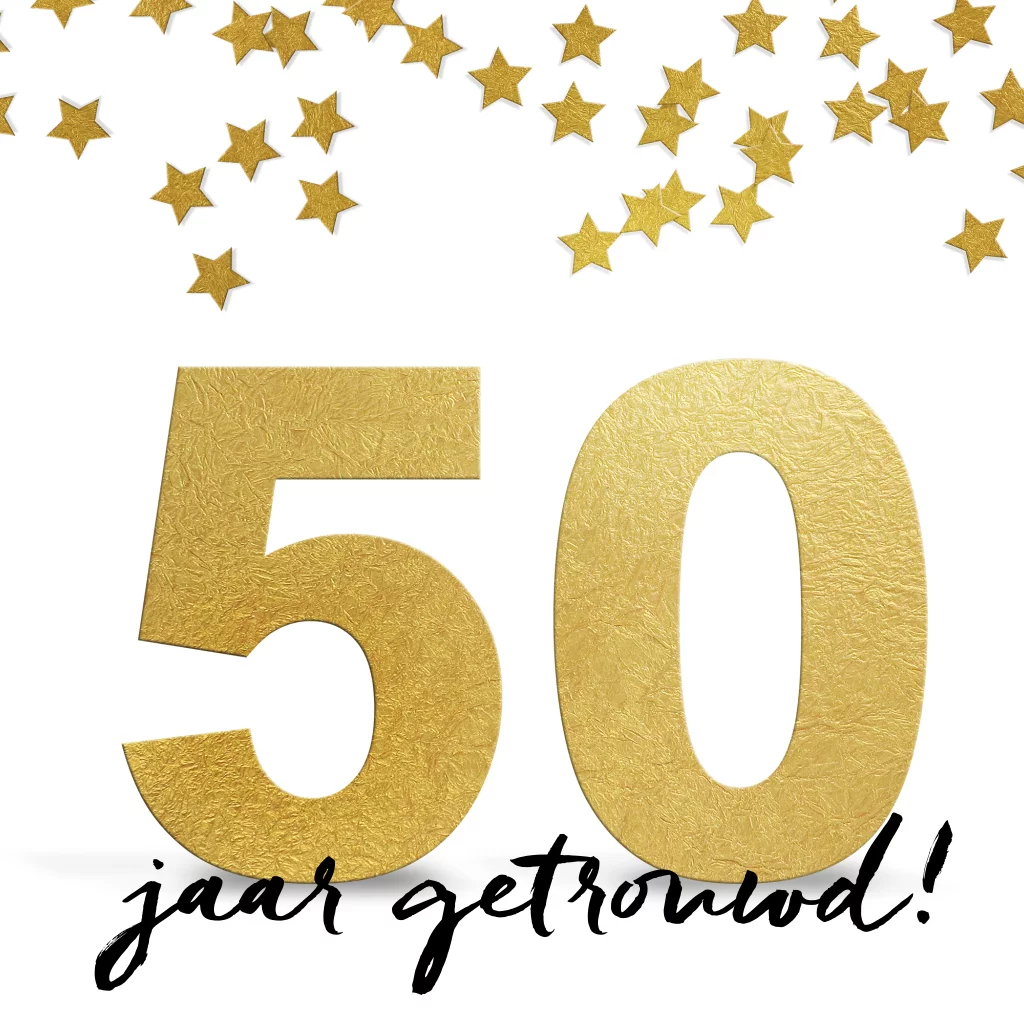 Nodig familie en vrienden uit voor jullie vijftigjarig huwelijksfeest met deze mooie uitnodigingskaart met gouden 50.