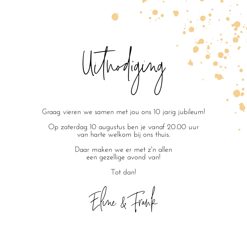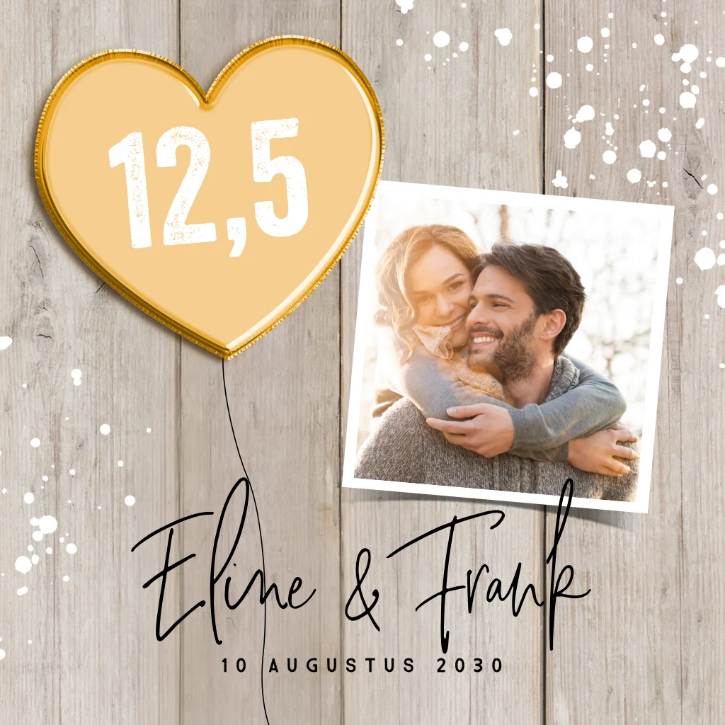 Originele uitnodiging voor een 12,5 jarig huwelijksjubileum met houten achtergrond, spetters en een gouden hartje.