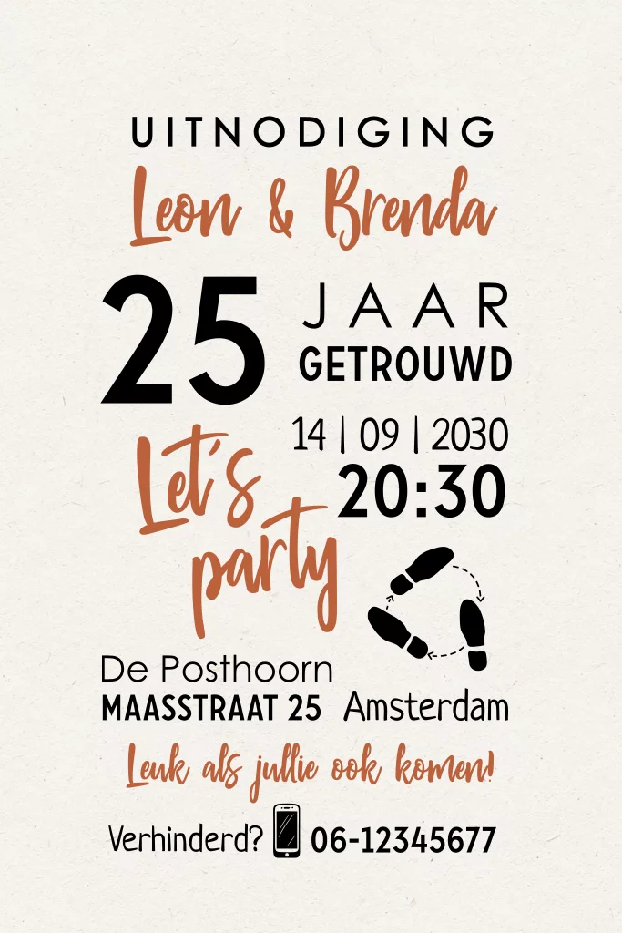 Originele jubileumkaart 25 jaar getrouwd typografisch. Pas de datum, locatie en jullie namen aan en maak zo eenvoudig je persoonlijke uitnodiging.
