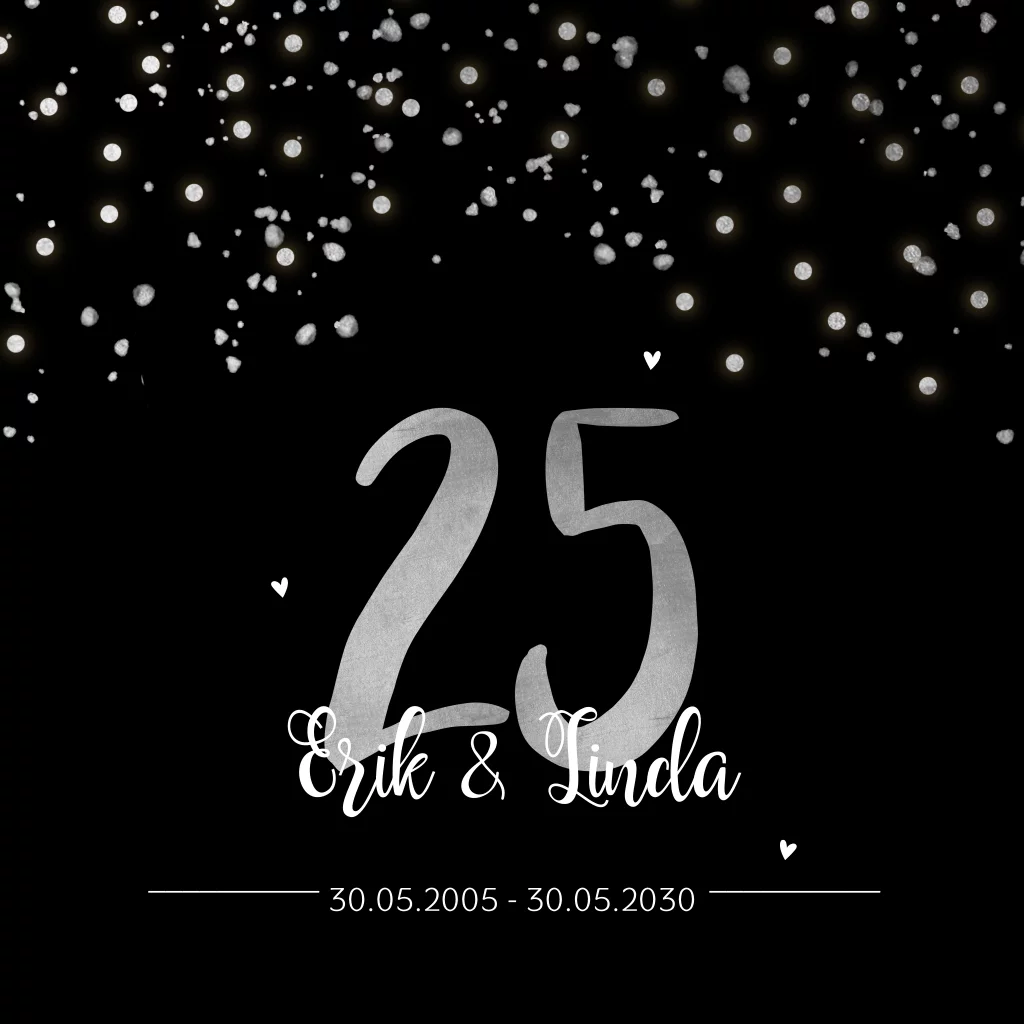 Chique uitnodiging 25-jarig jubileum met zilveren lampjes op een zwarte achtergrond.